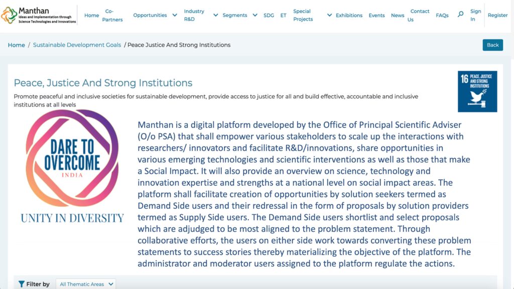 One of the outcomes of Dare to Overcome 2023 was that the Office of the Principle Scientific Advisor to the Government of India invited Dare to Overcome to curate Sustainable Development Goal (SDG) 16 — Peace, Justice & Strong Institutions — on their Manthan platform.